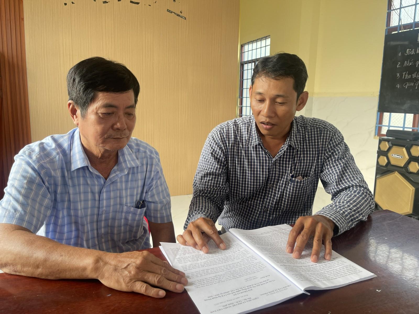 Ông Danh Thành Trí (bên phải) - Phó Chủ tịch Hội Cựu chiến binh xã Bình An trao đổi công việc cùng ông Nguyễn Tấn Chắc - Chi hội trưởng Chi hội Cựu chiến binh ấp Minh Phong. Ảnh: MỘC TRÀ