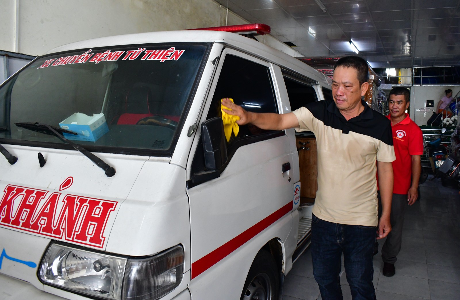 Ông Mai Hoàng Khánh vệ sinh xe chuyển bệnh từ thiện. Ảnh: BẢO TRÂN
