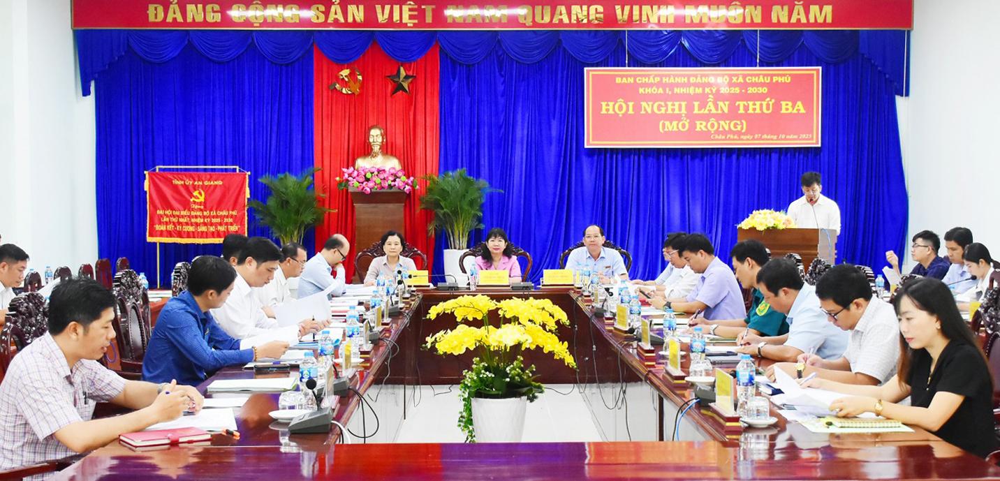 Hội nghị Ban Chấp hành Đảng bộ xã Châu Phú lần thứ 3 (mở rộng) đã thông qua các nội dung: Báo cáo kết quả công tác xây dựng Đảng, vận động quần chúng 9 tháng, phương hướng thực hiện 3 tháng cuối năm 2025; báo cáo kết quả thực hiện nhiệm vụ phát triển kinh tế - xã hội 9 tháng, phương hướng thực hiện 3 tháng cuối năm 2025; báo cáo tổng kết Nghị quyết 18-NQ/TW của Ban Chấp hành Trung ương Đảng khóa XII về “Một số vấn đề về tiếp tục đổi mới, sắp xếp tổ chức bộ máy của hệ thống chính trị tinh gọn, hoạt động hiệu lực, hiệu quả”.