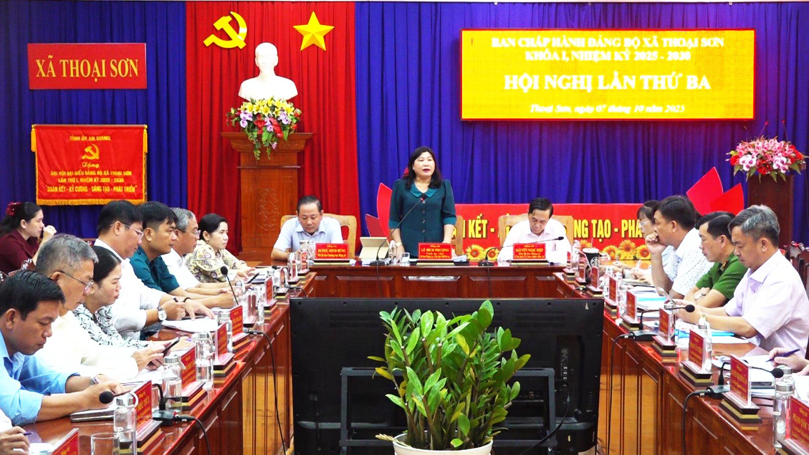 Phát biểu chỉ đạo hội nghị, Bí thư Đảng ủy, Chủ tịch HĐND xã Thoại Sơn Lê Bích Phượng nhấn mạnh, xã tiếp tục rà soát, hoàn thiện các chỉ tiêu trong chương trình xây dựng nông thôn mới, chủ động triển khai các nhiệm vụ trọng tâm trong 3 tháng cuối năm. Đồng thời, tập trung tháo gỡ khó khăn sau sáp nhập đơn vị hành chính, phấn đấu hoàn thành và vượt các chỉ tiêu nghị quyết đã đề ra, góp phần xây dựng xã Thoại Sơn ngày càng phát triển.