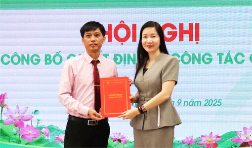 Phó Tổng Giám đốc Ngân hàng Chính sách xã hội Việt Nam Nguyễn Thị Hằng trao quyết định bổ nhiệm Giám đốc Ngân hàng Chính sách xã hội chi nhánh tỉnh An Giang cho ông Đoàn Công Thiệt.
