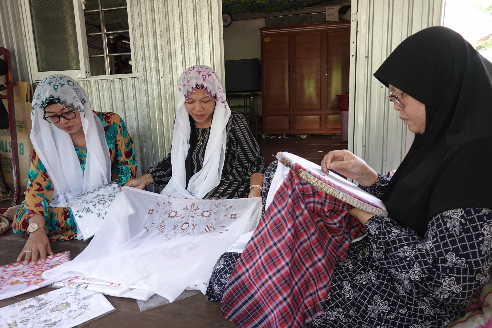 Phụ nữ Chăm giữ gìn nghề thêu khăn maspok truyền thống. Ảnh: MỸ HẠNH
