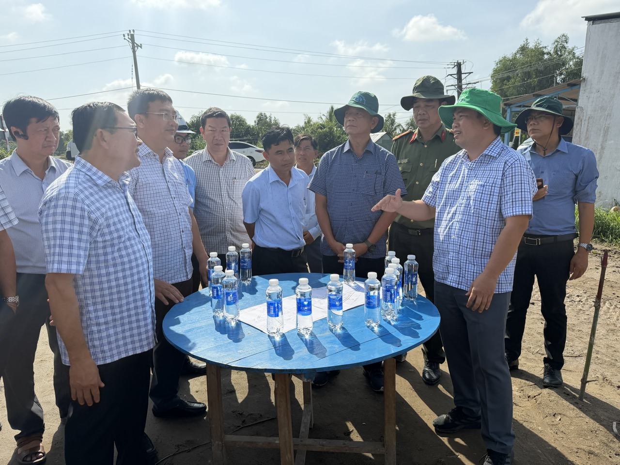 Phó Chủ tịch UBND tỉnh An Giang Lê Trung Hồ nghe đại diện UBND hai xã Gò Quao, Vĩnh Tuy báo cáo tiến độ, khó khăn trong thực hiện dự án đầu tư xây dựng đường Hồ Chí Minh đoạn Rạch Sỏi - Bến Nhứt, Gò Quao - Vĩnh Thuận.