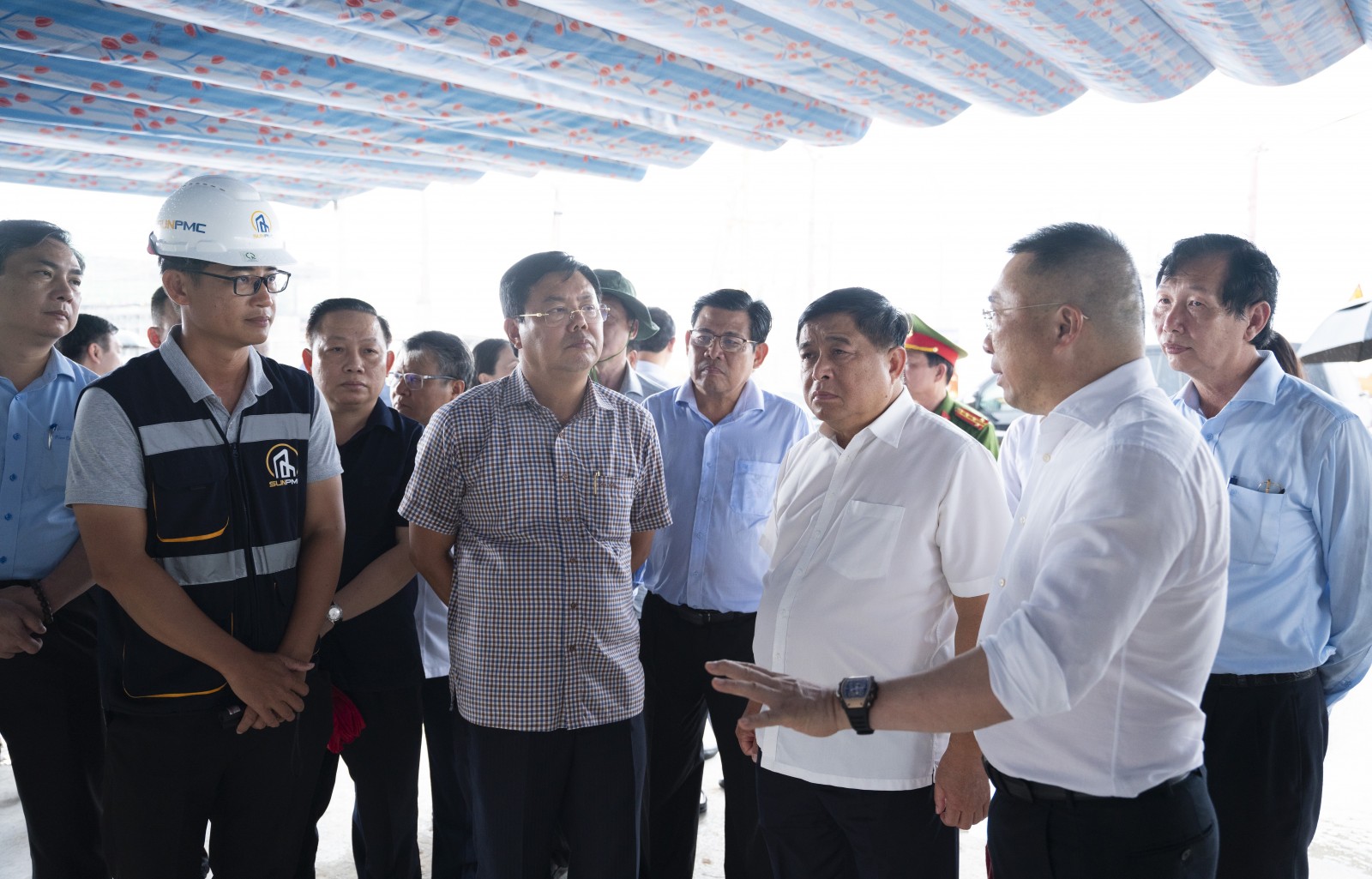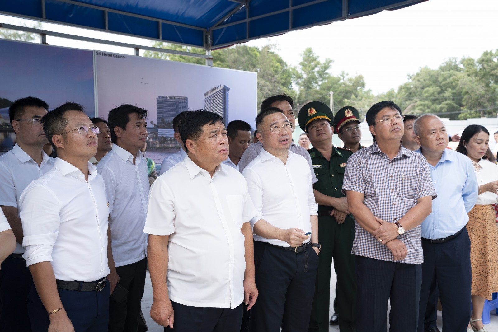 Phó Thủ tướng Chính phủ Nguyễn Chí Dũng và Bí thư Tỉnh ủy An Giang Nguyễn Tiến Hải, cùng lãnh đạo bộ, ngành Trung ương và tỉnh An Giang kiểm tra tiến độ thi công Trung tâm tổ chức Hội nghị APEC (Ảnh: TRUNG HIẾU)