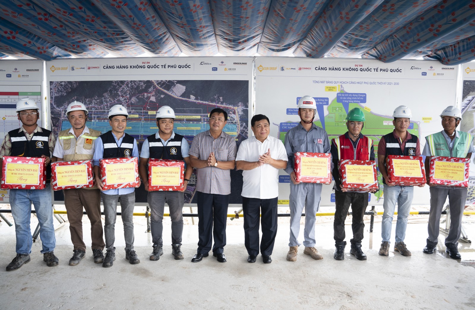 Phó Thủ tướng Chính phủ Nguyễn Chí Dũng và Bí thư Tỉnh ủy An Giang Nguyễn Tiến Hải tặng quà công nhân làm việc tại Dự án mở rộng Cảng hàng không quốc tế Phú Quốc. (Ảnh: TRUNG HIẾU)