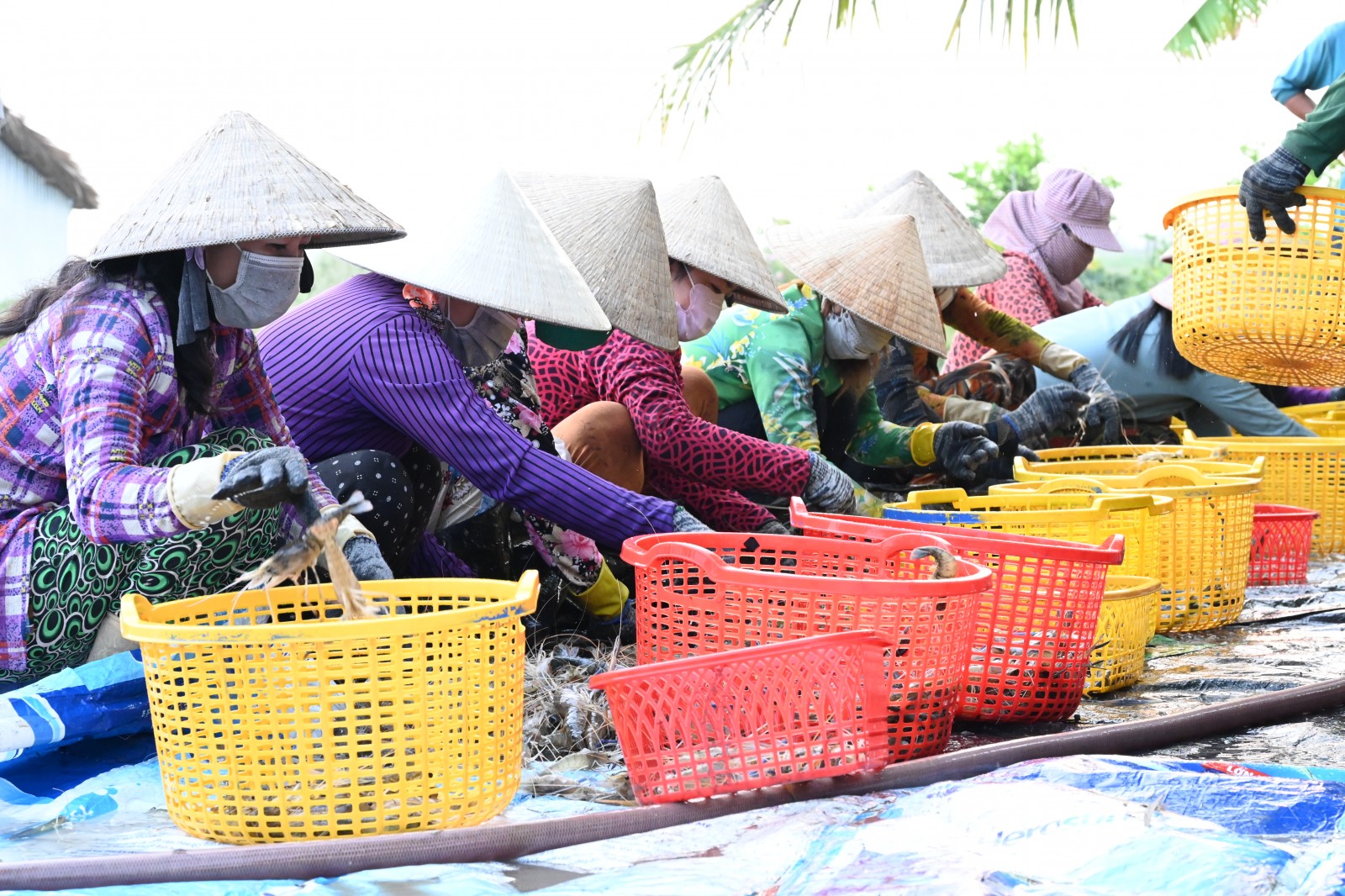 Phụ nữ xã Vĩnh Bình có thêm thu nhập nhờ việc lựa tôm càng xanh. Ảnh: THỦY TIÊN