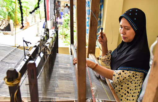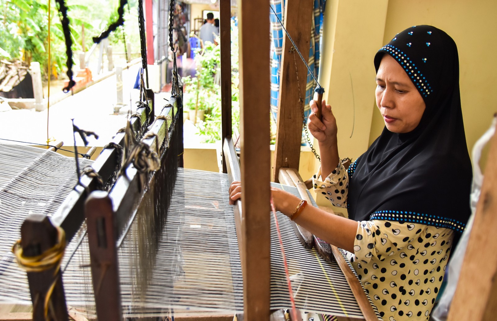 Phụ nữ Chăm xã Châu Phong giữ gìn nghề dệt thổ cẩm. Ảnh: THỦY TIÊN