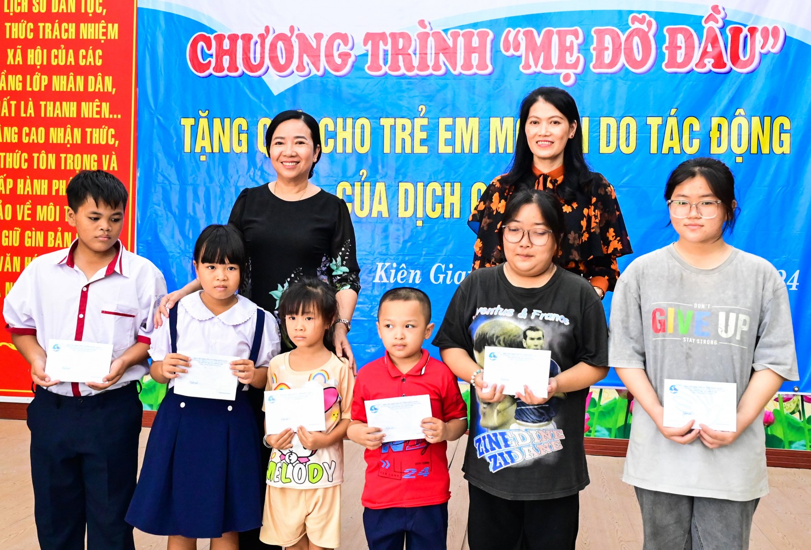 Bà Nguyễn Thị Quyến (hàng sau, bên phải) - Phó Chủ tịch Thường trực Hội Liên hiệp Phụ nữ tỉnh trao quà cho trẻ mồ côi trên địa bàn xã Hòn Đất. Ảnh: THỦY TIÊN
