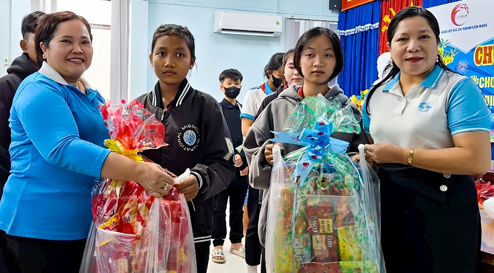 Bà Lê Thị Ngọc Dung (bìa phải) - Phó Chủ tịch Hội Liên hiệp Phụ nữ tỉnh trao quà Tết cho trẻ em mồ côi trên địa bàn xã Giồng Riềng. Ảnh: THỦY TIÊN