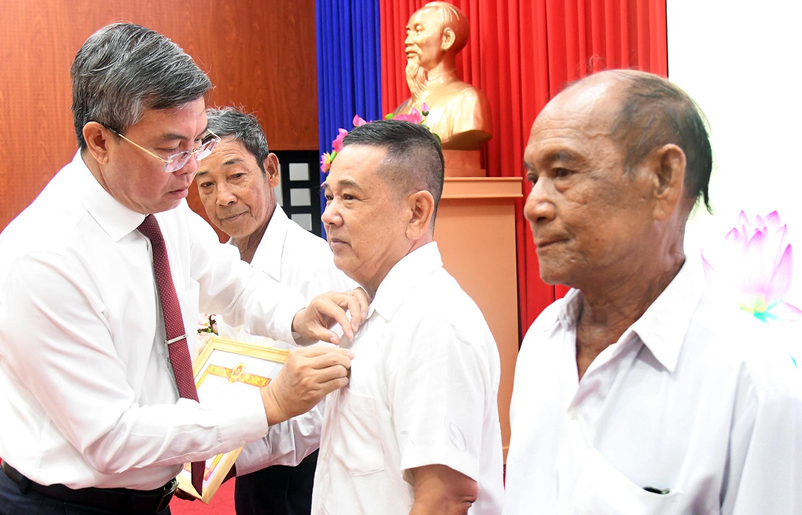 Tỉnh ủy viên, Bí thư Đảng ủy phường Hà Tiên Nguyễn Lưu Trung trao Huy hiệu Đảng cho các đồng chí 40 năm tuổi Đảng.