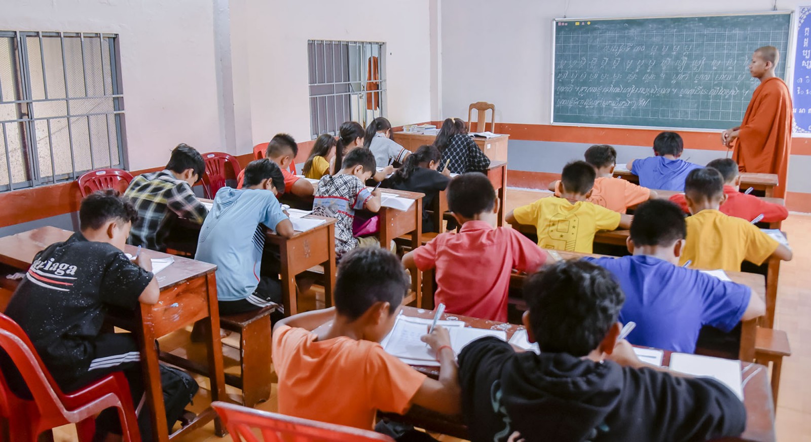 Quang cảnh lớp học chữ Khmer tại chùa Tà Teng.