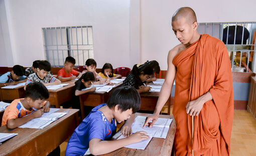 Hơn 15 năm qua, mỗi dịp hè, chùa Tà Teng, xã Giang Thành (An Giang) lại rộn ràng tiếng tập đọc chữ Khmer của trẻ em cùng tiếng giảng bài của các vị sư sãi.