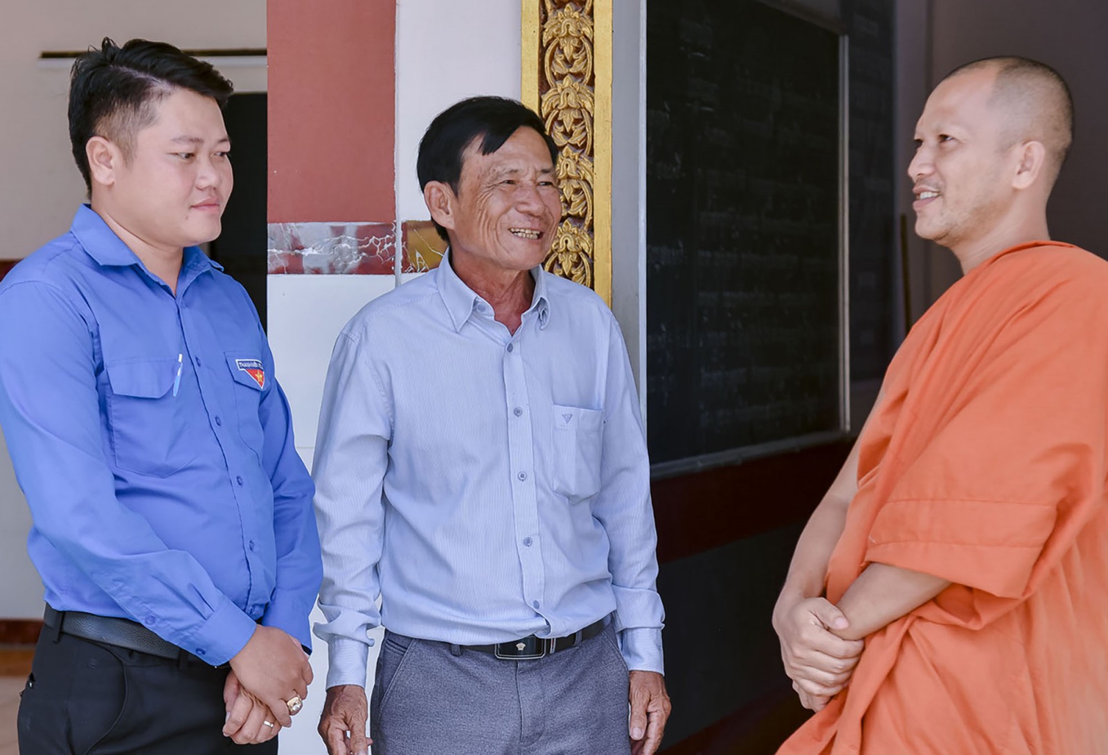 Phó Bí thư Xã đoàn Giang Thành Tăng Văn Toàn (bìa trái) và Bí thư Chi bộ, Trưởng ấp Tà Teng Trần Văn Tính (giữa) trao đổi với trụ trì chùa Tà Teng những khó khăn trong quá trình dạy học.