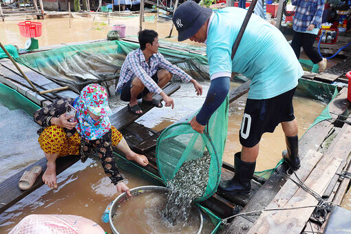 Dạo rày, cá linh lớn dần theo con nước, đã to hơn đầu đũa ăn. Nếu như ở xã Nhơn Hội, cá linh rọng sống giá 20.000 - 30.000 đồng/kg thì ở các chợ tại phường Long Xuyên, Bình Khánh khoảng 150.000 đồng/kg. Những năm gần đây, vào mùa lũ, người dân nước bạn Campuchia cũng dùng ngư cụ đú (dớn) khai thác “hứng” nguồn cá linh trên đồng. Vì vậy, nguồn cá linh non trôi theo dòng sông về hạ nguồn giảm mạnh. Những chiếc vỏ lãi của người dân nước bạn Campuchia gắn máy sục khí oxy thổi cá linh non cuồn cuộn trong khoang. Nguồn cá vừa cập bến, chị Võ Thị Sương (44 tuổi) giao tiếp bằng tiếng Campuchia để thu mua cá linh.