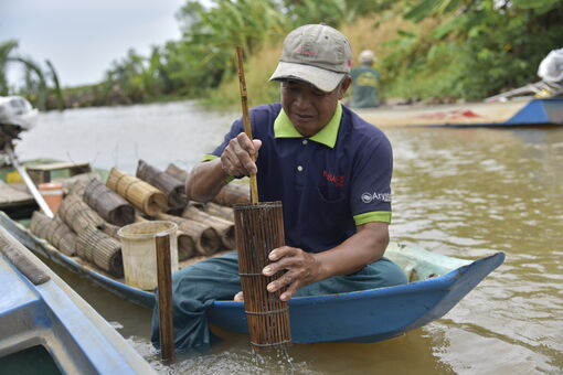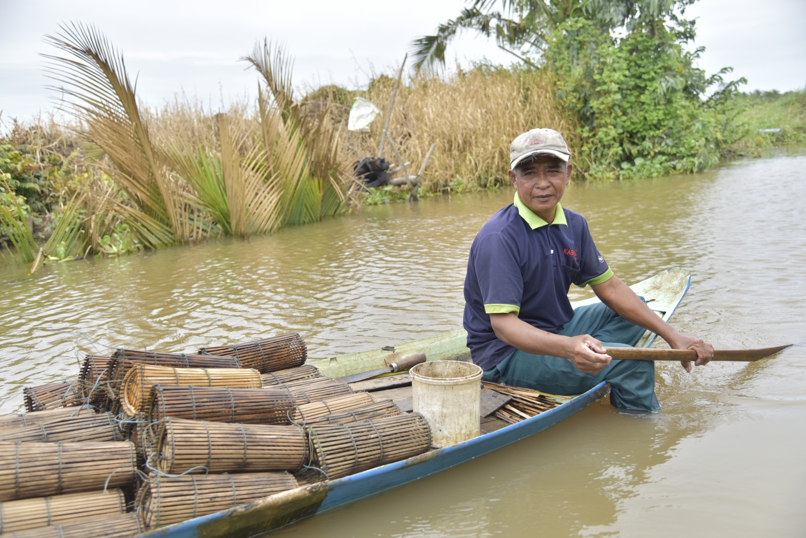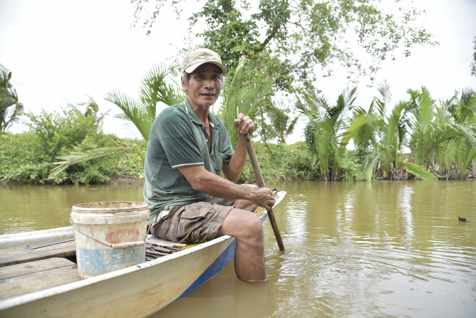 Ông Danh Chup bơi xuồng chở lọp tre trên kênh tìm chỗ đặt lọp cá bống dừa.