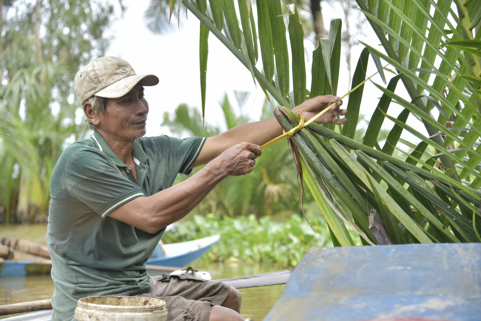 Ông Hồ Văn Mỹ cột lá dừa làm dấu mỗi khi đặt xong một chiếc lọp.