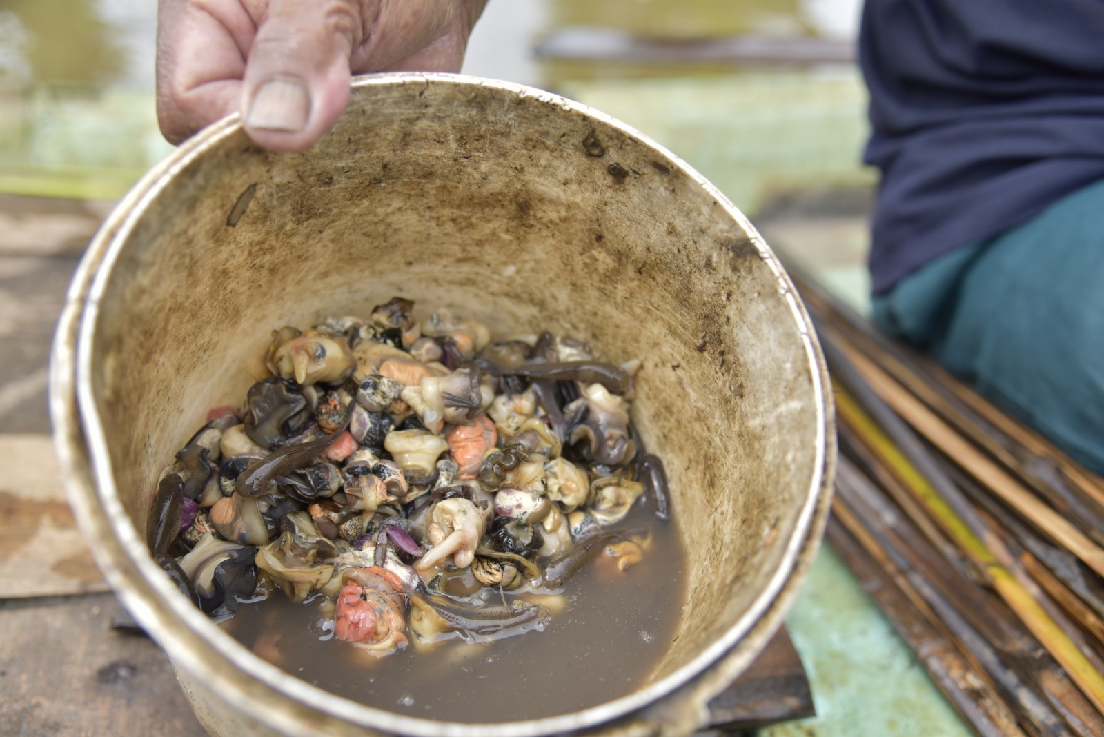 Ốc và còng giã dập là thứ mồi khoái khẩu của cá bống dừa.