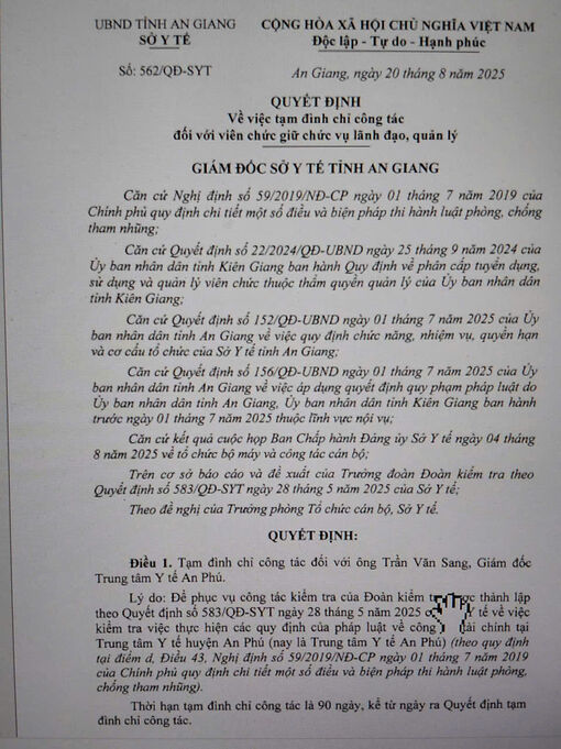 Cụ thể, tạm đình chỉ công tác đối với Giám đốc Trung tâm Y tế An Phú Trần Văn Sang 90 ngày để phục vụ công tác kiểm tra của đoàn kiểm tra được thành lập theo Quyết định 583/QĐ-SYT của Sở Y tế tỉnh về việc kiểm tra việc thực hiện các quy định của pháp luật về công tác tài chính tại Trung tâm Y tế huyện An Phú (nay là Trung tâm Y tế An Phú); đồng thời, làm rõ một số nội dung mà các cán bộ Trung tâm Y tế An Phú đã tố cáo.
