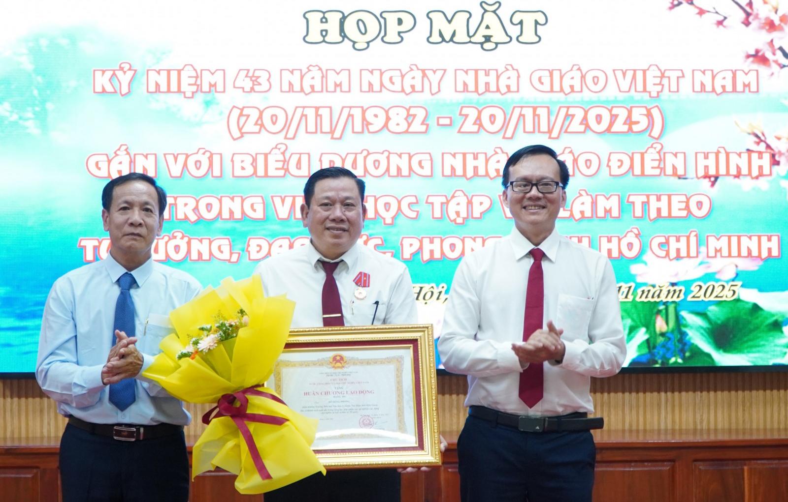 Hiệu trưởng Trường Tiểu học Tân Hòa 2 Đỗ Hồng Phong (giữa), nhận Huân chương Lao động hạng Ba.