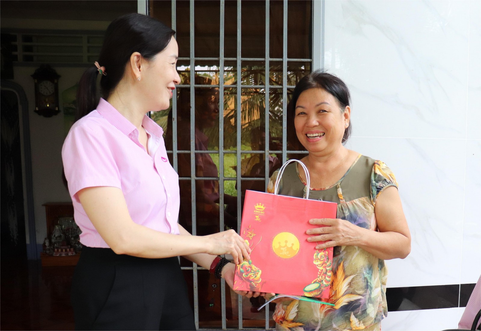 Phó Tổng Giám đốc Ngân hàng Chính sách xã hội Việt Nam Nguyễn Thị Hằng (bên trái) tặng quà hộ nghèo xã Long Thạnh đang vay vốn tín dụng chính sách.