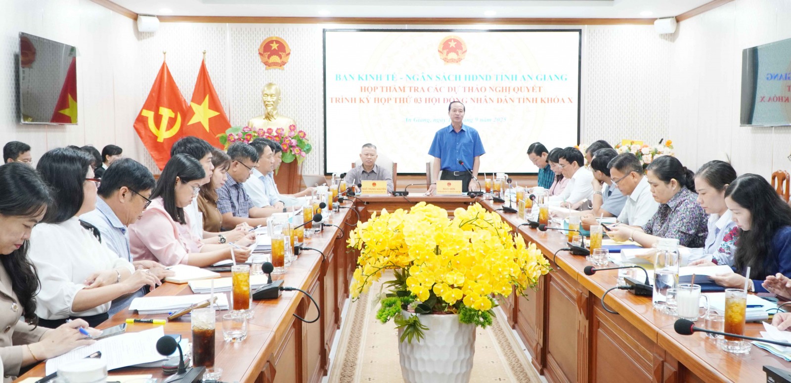Cuộc họp tiến hành thẩm tra các dự thảo nghị quyết: Điều chỉnh, bổ sung kế hoạch đầu tư công trung hạn giai đoạn 2021 - 2025 nguồn vốn ngân sách Trung ương và nguồn vốn địa phương trên địa bàn tỉnh; điều chỉnh, bổ sung kế hoạch đầu tư công năm 2025 nguồn vốn ngân sách Trung ương và nguồn địa phương trên địa bàn tỉnh; quy định mức chi đón tiếp, thăm hỏi, chúc mừng đối với một số đối tượng do Ủy ban Mặt trận Tổ quốc Việt Nam các cấp thực hiện trên địa bàn tỉnh; quy định mức chi công tác phí, chi hội nghị trên địa bàn tỉnh; thông qua đề án thành lập Quỹ đầu tư phát triển tỉnh An Giang trên cơ sở hợp nhất Quỹ đầu tư phát triển Kiên Giang và Quỹ đầu tư phát triển tỉnh An Giang.