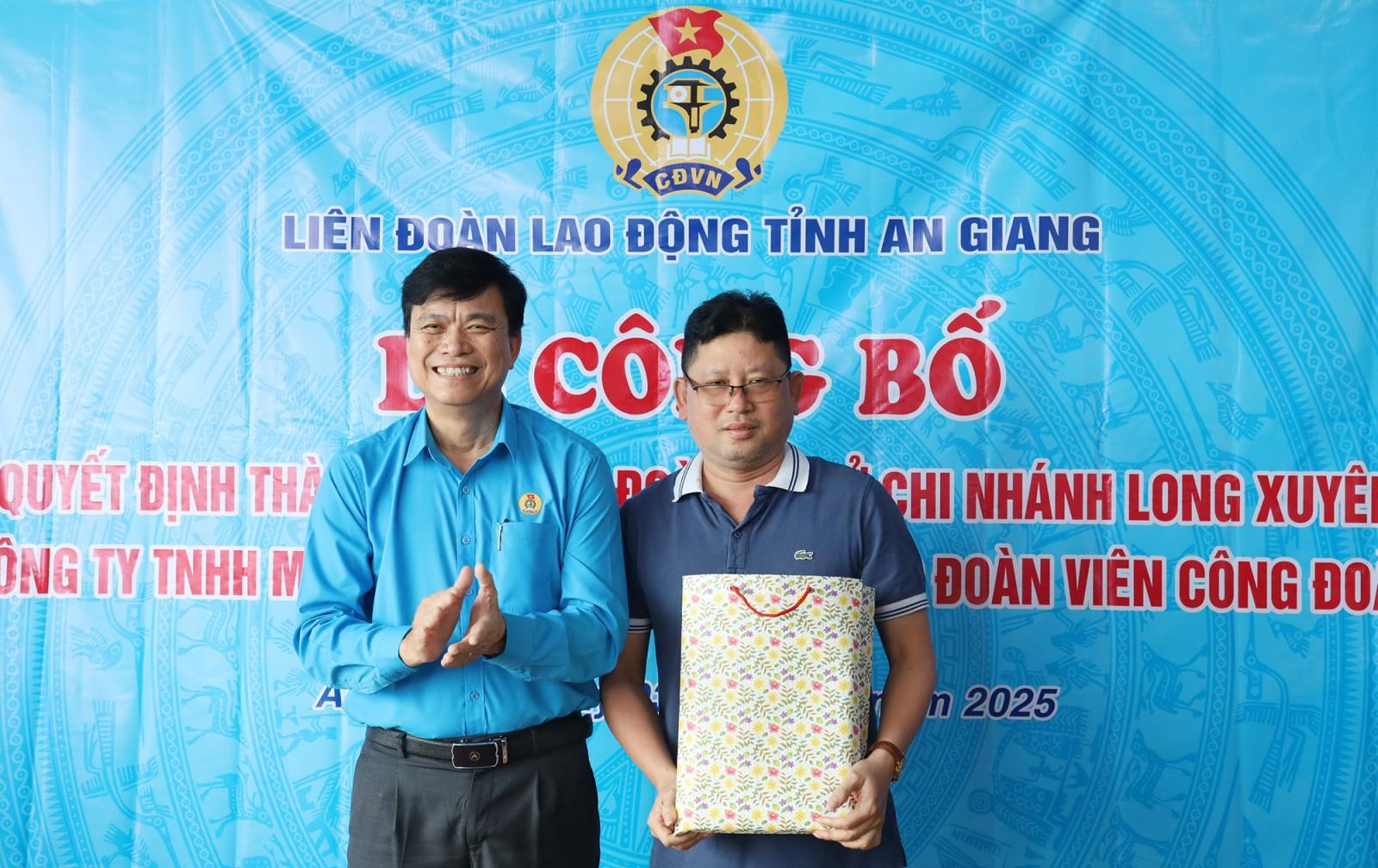 Cùng với đó, công bố quyết định thành lập Công đoàn cơ sở Chi nhánh Long Xuyên Công ty TNHH May mặc Lai Vung trực thuộc Liên đoàn Lao động tỉnh, với 243 đoàn viên, kể từ ngày 14/10/2025.