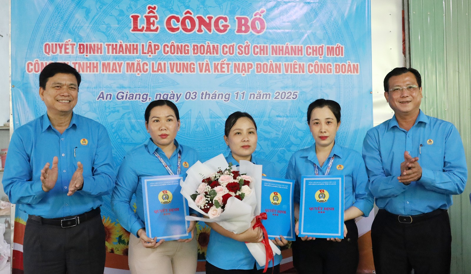 Công bố quyết định thành lập Công đoàn cơ sở Chi nhánh Chợ Mới Công ty TNHH May mặc Lai Vung trực thuộc Liên đoàn Lao động tỉnh, với 102 đoàn viên, kể từ ngày 14/10/2025.