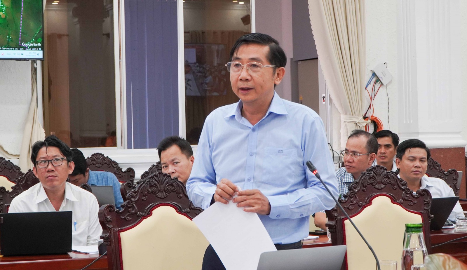 Giám đốc Sở Xây dựng tỉnh An Giang Lê Việt Bắc phát biểu tại cuộc họp.