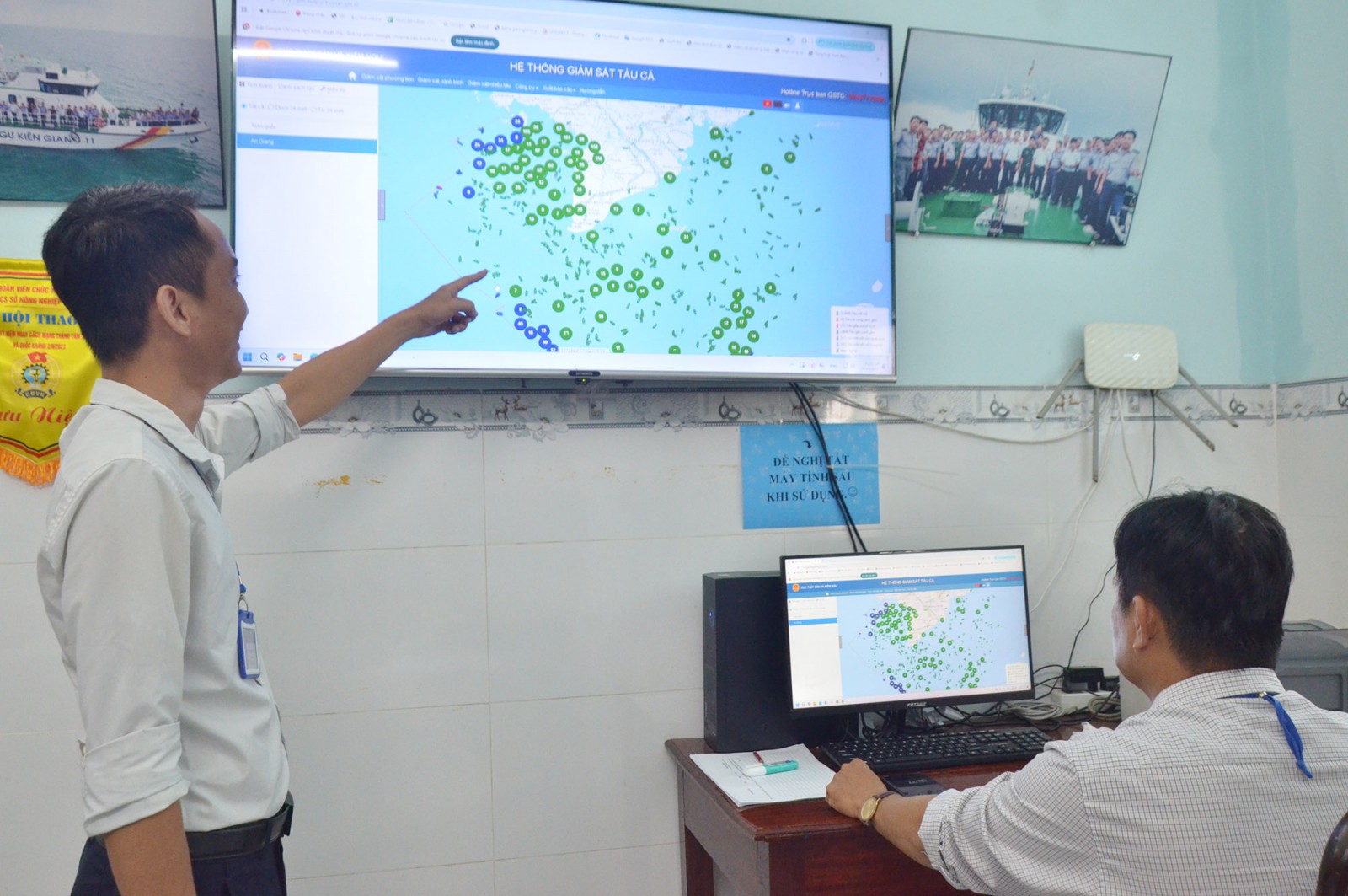 Ban điều hành cảng cá Tắc Cậu, xã Bình An theo dõi tàu cá trên màn hình qua thiết bị giám sát hành trình.