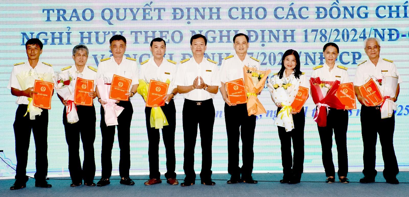 Trưởng Thuế tỉnh An Giang Nguyễn Thanh Bình (giữa) trao quyết định nghỉ hưu trước tuổi, nghỉ thôi việc theo Nghị định 178/2024/NĐ-CP và Nghị định 67/2025/NĐ-CP đợt 1/8/2025.