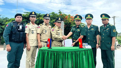 Thượng tá Nguyễn Tấn Dương, Đồn trưởng Đồn Biên phòng Cửa khẩu quốc tế Hà Tiên và Đại tá Bun Pich Narot, Phó Đồn trưởng Đồn công an Cửa khẩu quốc tế Prek Chak (Vương quốc Campuchia) ký biên bản tiếp nhận công dân
