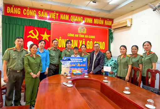 Hội Phụ nữ Công an tỉnh cùng lãnh đạo Phòng Công tác chính trị Công an tỉnh thăm, tặng quà em Danh Thảo Nguyên, ngụ xã Gò Quao. Ảnh: THỦY TIÊN