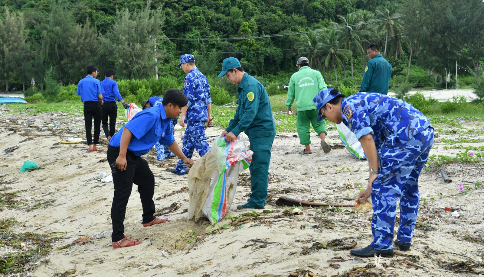 Đoàn viên, thanh niên Bộ Tư lệnh Vùng Cảnh sát biển 4 phối hợp đoàn viên, thanh niên phường Hà Tiên ra quân dọn vệ sinh bờ biển.