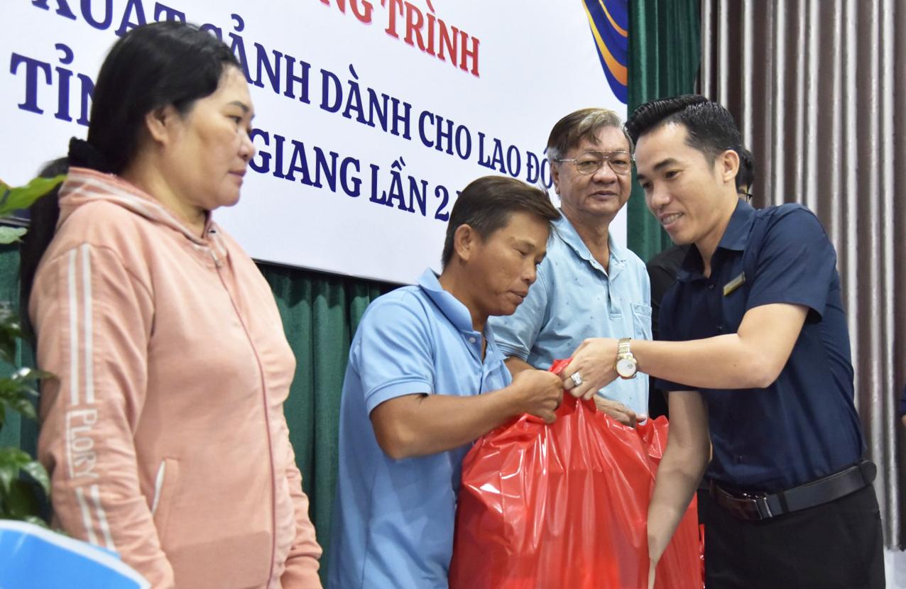 Giám đốc Công ty Cổ phần Giáo dục quốc tế Capeco chi nhánh Kiên Giang Đặng Quốc Huy trao quà cho các hộ nông dân có hoàn cảnh khó khăn.