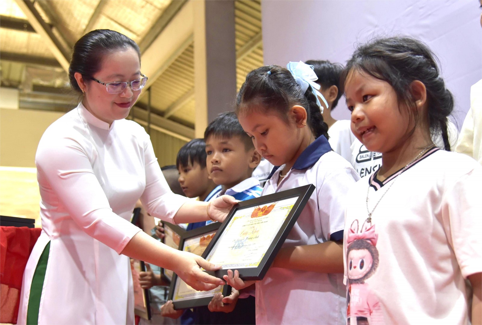 Bà Nguyễn Tuyết Trinh, Trưởng phòng Tổ chức - Nhân sự Công ty Cổ phần Thái Bình Kiên Giang trao học bổng cho học sinh.