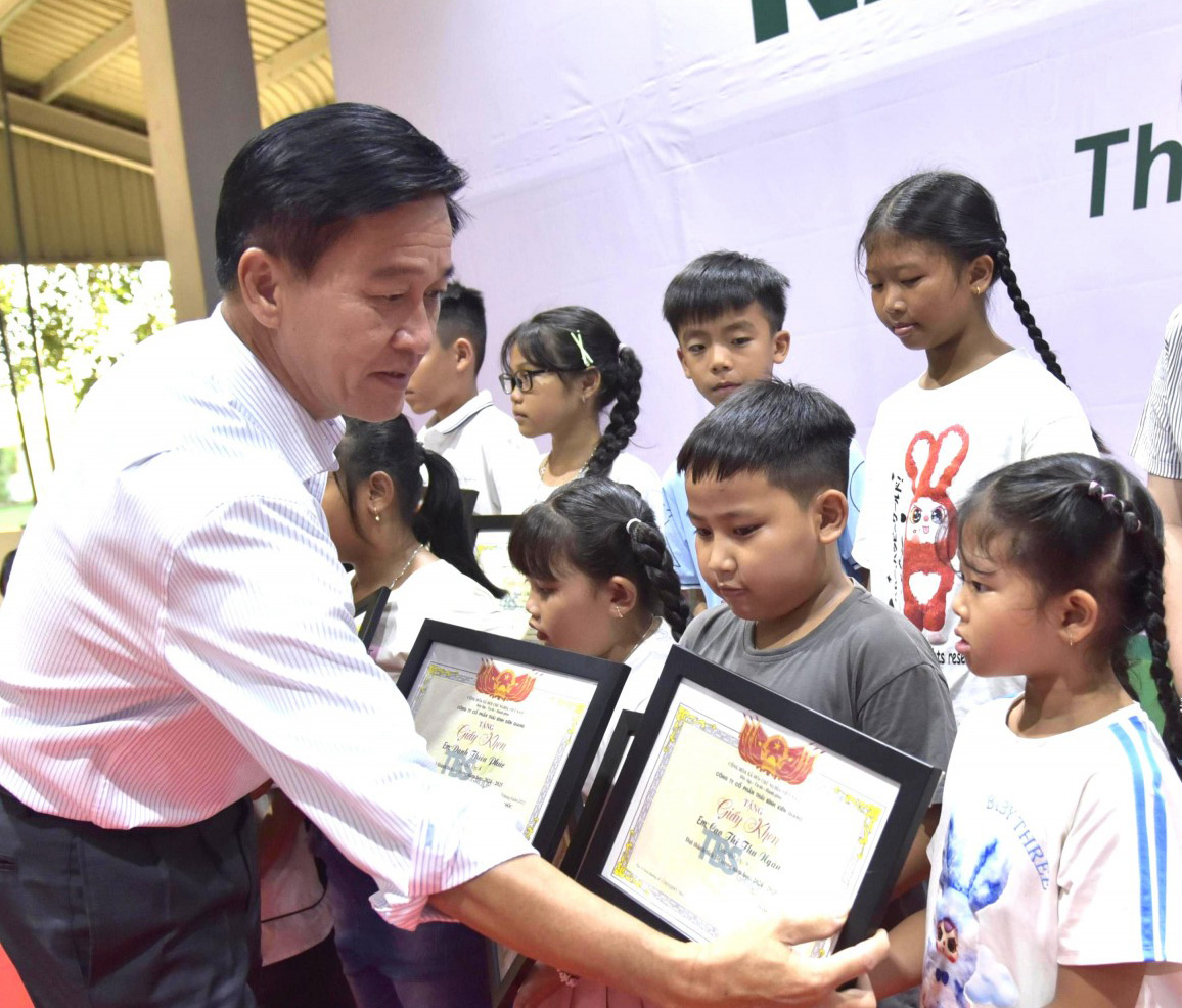 Trưởng Ban Quản lý Khu Kinh tế tỉnh An Giang Trần Minh Nhựt trao học bổng TBS Group cho học sinh.