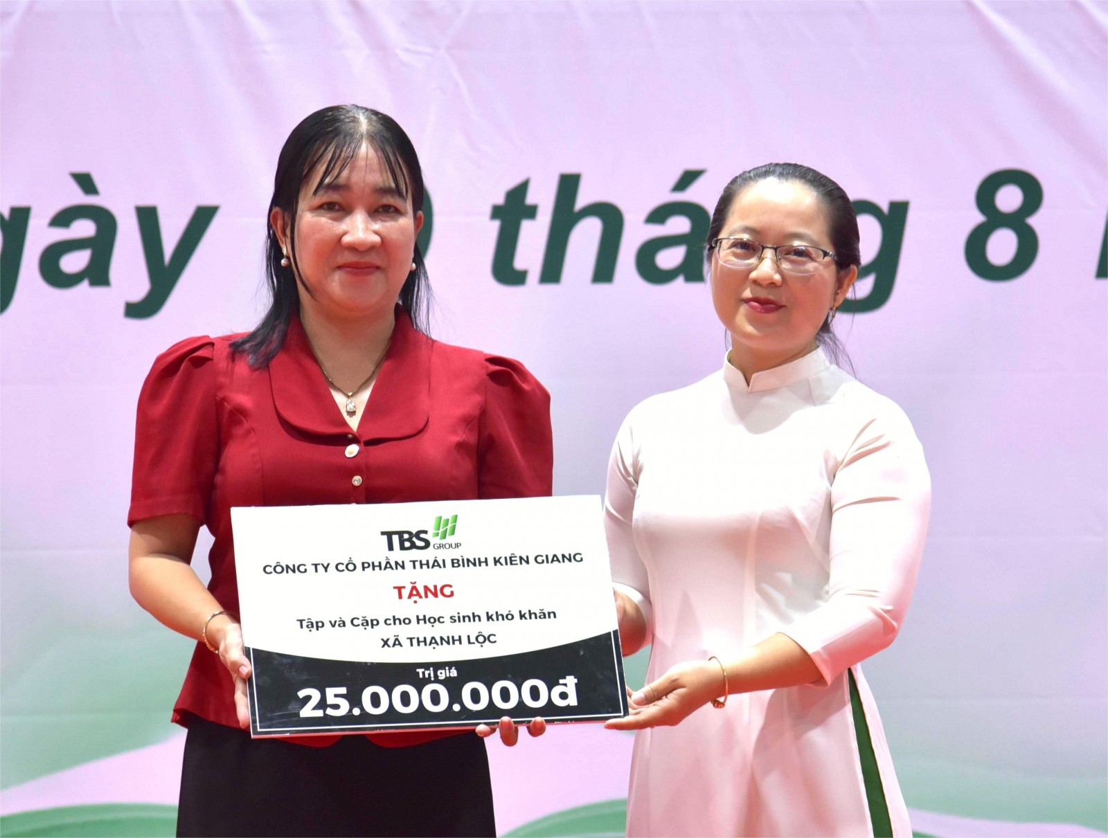 Dịp này, Công ty Cổ phần Thái Bình Kiên Giang tặng cặp và tập cho học sinh có hoàn cảnh khó khăn xã Thạnh Lộc, với trị giá 25 triệu đồng.