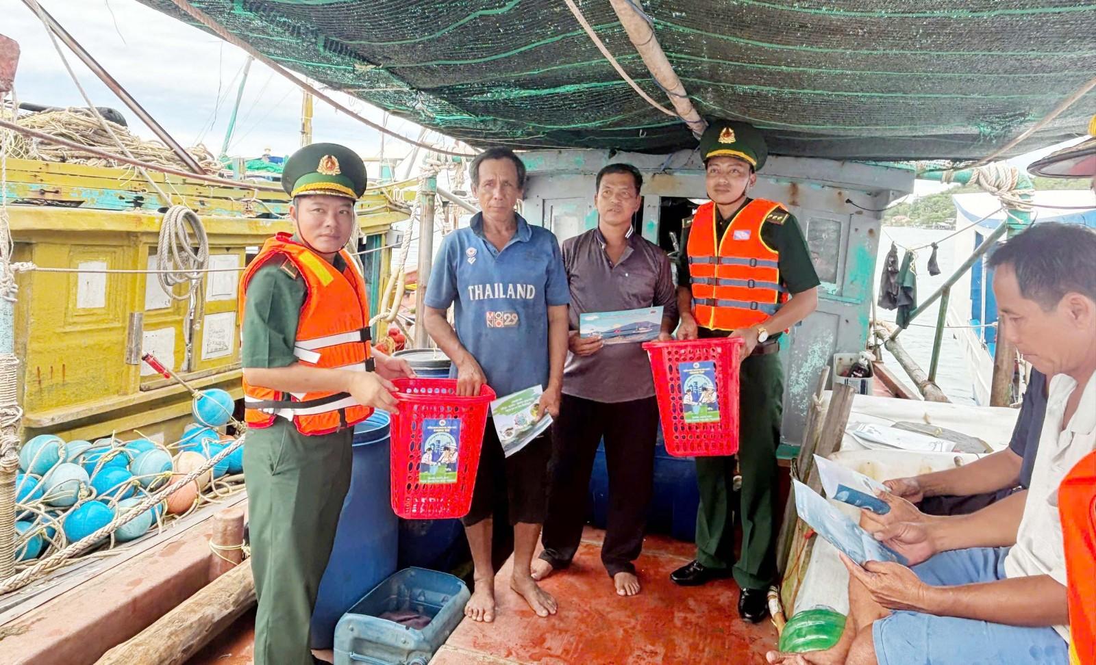 Cán bộ Đồn Biên phòng Tiên Hải tặng sọt đựng rác cho các hộ dân nuôi cá lồng bè, khai thác hải sản.
