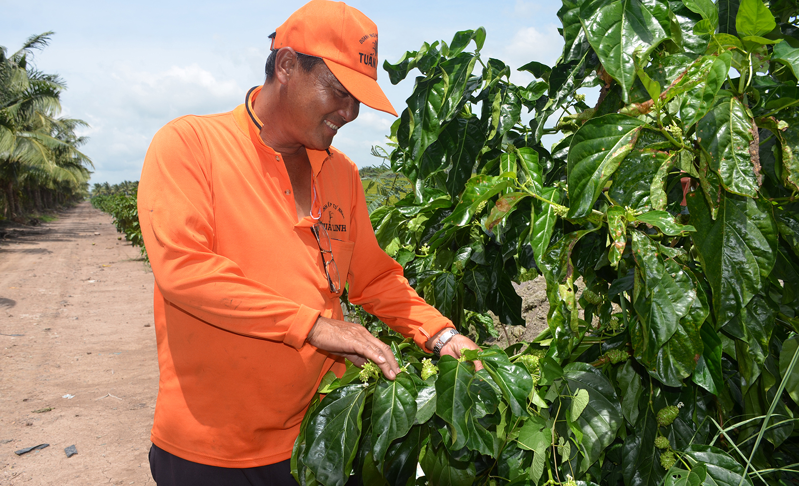 Anh Tuấn cho biết qua tìm hiểu anh biết cây nhàu là loại dược liệu quý trong y học cổ truyền. “Gần đây, một số địa phương như Cà Mau, TP. Hồ Chí Minh có nhiều doanh nghiệp, công ty sản xuất, chế biến trái nhàu thành các loại dược liệu, thực phẩm chức năng tốt cho sức khỏe. Vì vậy, tôi mạnh dạn trồng 40.000 cây nhàu trên phần diện tích đất trống dọc theo đê bao xung quanh trang trại, vừa tạo bóng mát, chắn gió, giữ đất vừa có thể thu hoạch trái tươi cung cấp cho các công ty sản xuất dược liệu”, anh Tuấn chia sẻ.