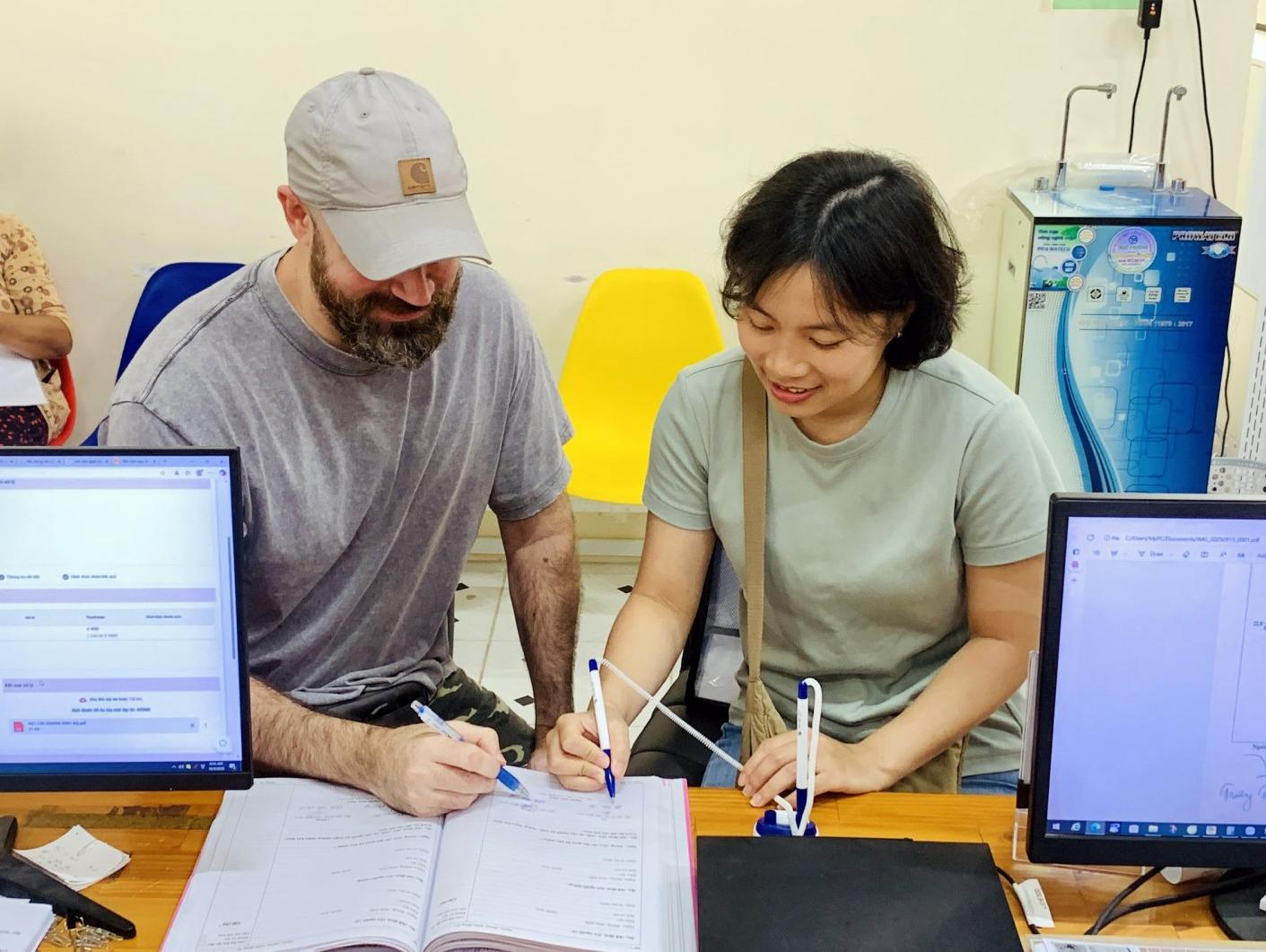 Anh Sikes Wiliam Joseph và chị Lê Thị Nở ký giấy chứng nhận kết hôn.