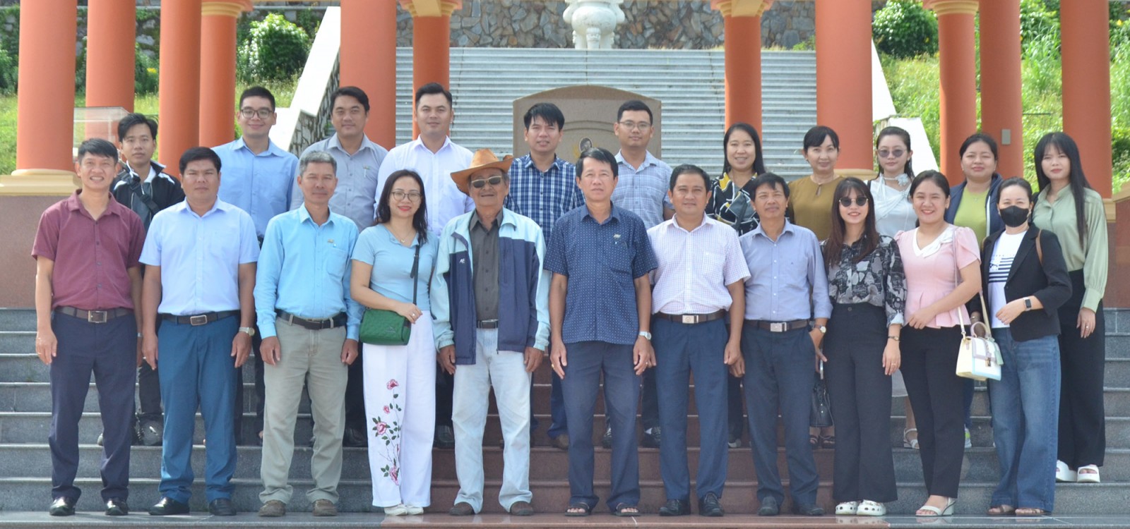 Lãnh đạo Báo và Phát thanh - Truyền hình tỉnh An Giang và giảng viên, học sinh Trường Đào tạo, bồi dưỡng cán bộ khoa học và công nghệ chụp hình lưu niệm tại mộ liệt sĩ, Anh hùng Lực lượng vũ trang nhân dân Phan Thị Ràng.
