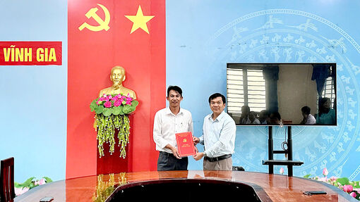 Bí thư Đảng ủy xã Vĩnh Gia Nguyễn Văn Bé Tám (bên phải) trao Quyết định chỉ định Bí thư Đảng ủy UBND xã Vĩnh Gia.
