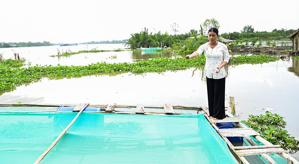 Chị Trần Ngọc Bích, ngụ xã Vĩnh Hòa thử nghiệm mô hình nuôi cá ven sông Cái Lớn. Ảnh: THỦY TIÊN