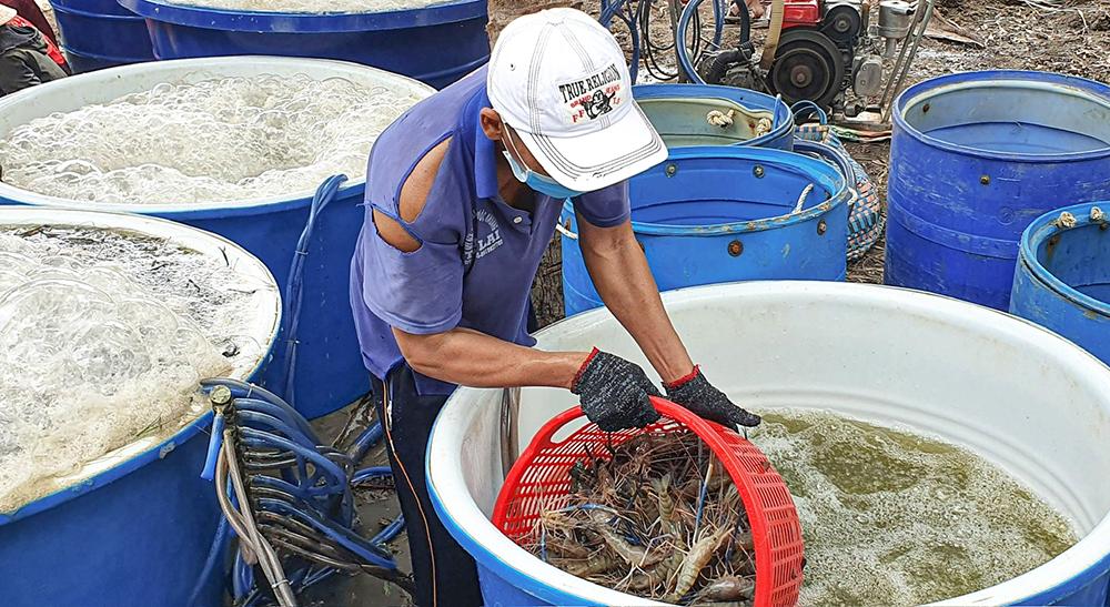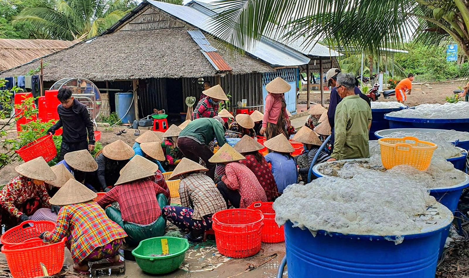 Nông dân ấp Vĩnh Trung, xã Vĩnh Hòa thu hoạch tôm cân cho thương lái. Ảnh: VIỆT TIẾN