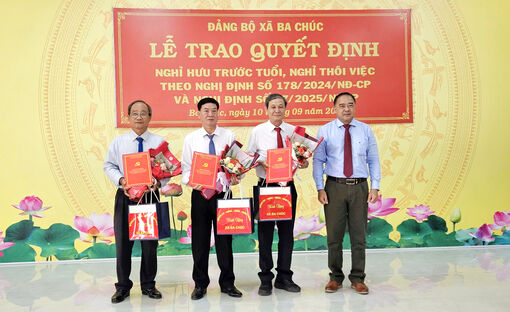 Ngày 10/9, Đảng ủy, HĐND, UBND, UBMTTQVN xã Ba Chúc (tỉnh An Giang) tổ chức lễ công bố và trao quyết định nghỉ hưu, nghỉ thôi việc theo Nghị định số 178/2024/NĐ-CP và Nghị định số 67/2025/NĐ-CP của Chính phủ cho các cán bộ.