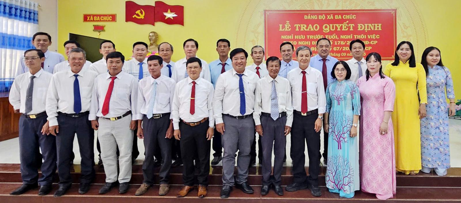 Tại hội nghị, Đảng ủy, HĐND, UBND, UBMTTQVN xã Ba Chúc đã công bố và trao quyết định nghỉ hưu trước tuổi, nghỉ thôi việc theo Nghị định số 178 và Nghị định số 67 cho 7 đồng chí thuộc các cơ quan khối Đảng, đoàn thể; 8 đồng chí thuộc cơ quan UBND xã.