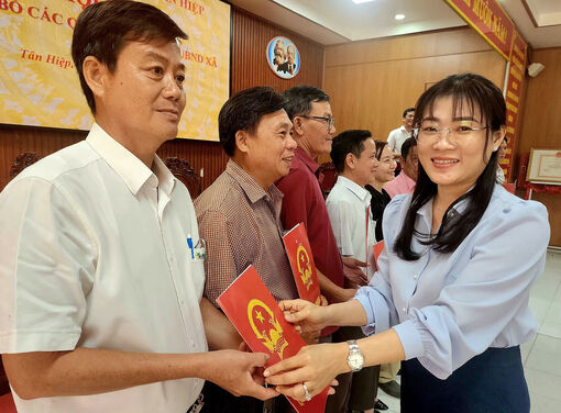 Phó Chủ tịch UBND xã Tân Hiệp Trần Thị Xuân Uyên trao quyết định bổ nhiệm viên chức quản lý các trường học.