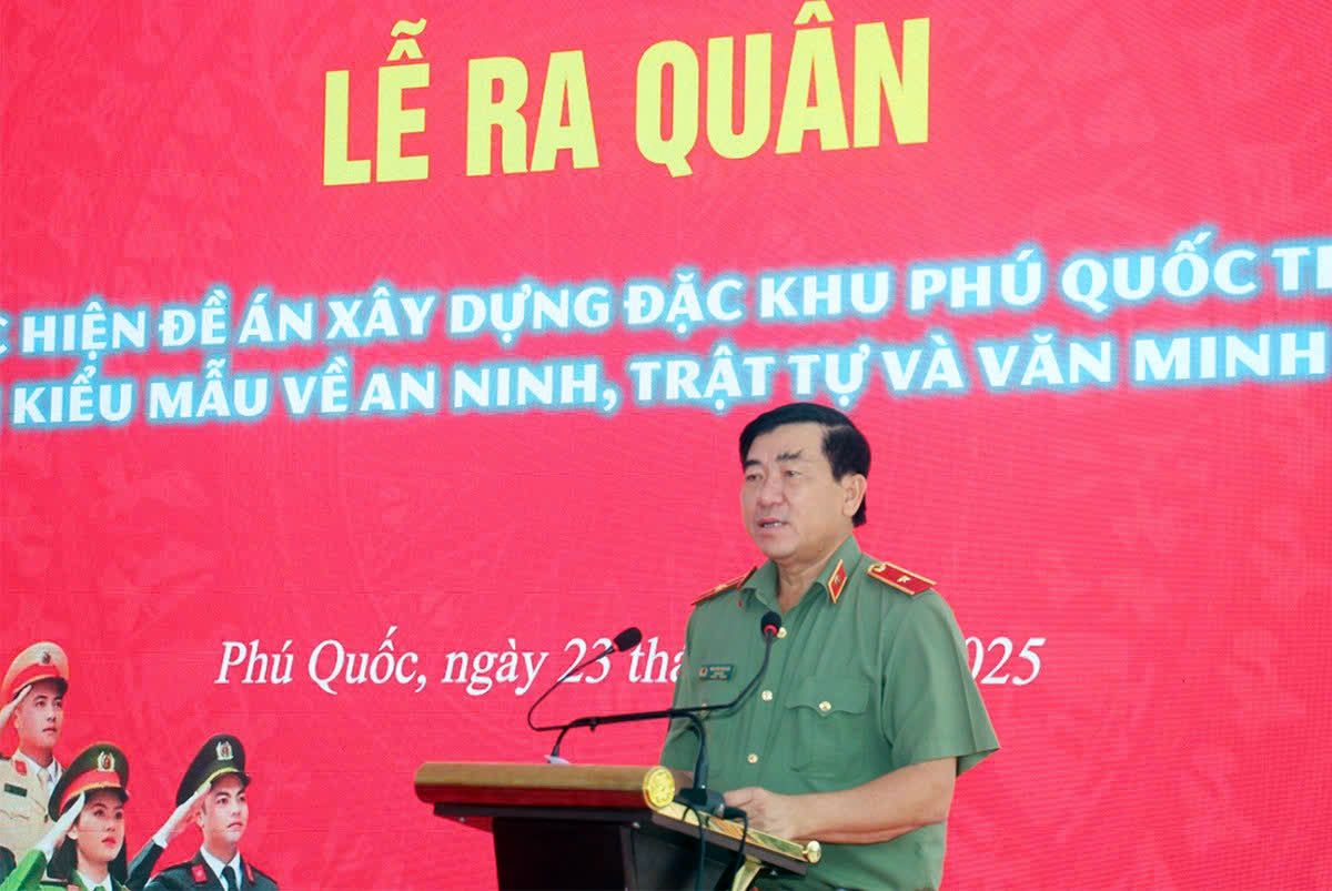 Phát biểu tại buổi lễ, Thượng tướng Phạm Thế Tùng, Thứ trưởng Bộ Công an cho biết, triển khai thực hiện ý kiến chỉ đạo của đồng chí Tổng Bí thư Tô Lâm về mục tiêu xây dựng Phú Quốc thành trung tâm du lịch sinh thái nghỉ dưỡng đẳng cấp quốc tế, góp phần xây dựng tỉnh An Giang trở thành trung tâm kinh tế biển quốc gia, trung tâm phát triển năng động, toàn diện và bền vững của vùng đồng bằng sông Cửu Long, giữ vai trò kết nối chiến lược Đông - Tây, biển - biên giới, đô thị - nông thôn, dịch vụ - sản xuất - du lịch. Đồng thời, tạo môi trường an ninh, an toàn, lành mạnh phục vụ tổ chức thành công Hội nghị APEC 2027, Đảng ủy Công an Trung ương, Bộ Công an đã thống nhất với tỉnh An Giang triển khai chủ trương xây dựng đặc khu Phú Quốc thành “Đơn vị kiểu mẫu về ANTT và văn minh đô thị” trong năm 2026. Đây là nhiệm vụ chính trị trọng tâm mà Đảng ủy Công an Trung ương, Bộ Công an và Tỉnh ủy, HĐND, UBND tỉnh An Giang tập trung lãnh đạo, chỉ đạo quyết liệt.