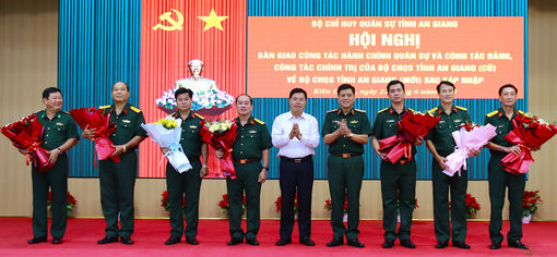 Lãnh đạo tỉnh và Quân khu 9 tặng hoa chúc mừng các đồng chí trong Bộ Chỉ huy Quân sự tỉnh An Giang. Ảnh: TRÚC LINH