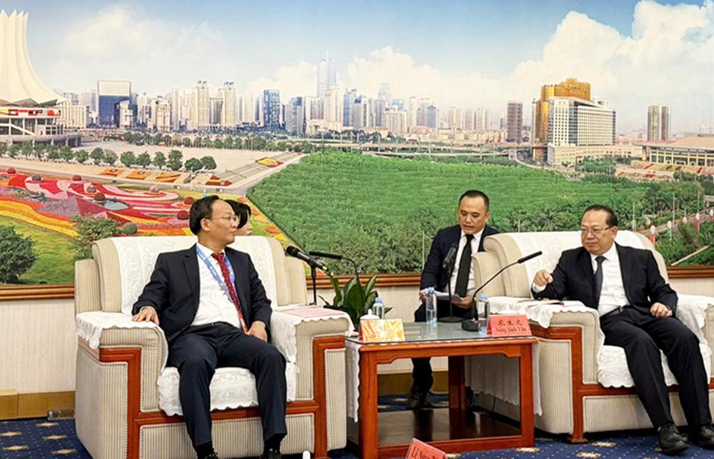 | Đồng chí Phạm Văn Thịnh, Ủy viên Ban Thường vụ Tỉnh ủy, Phó Chủ tịch UBND tỉnh và Đoàn công tác chào xã giao đồng chí Nông Sinh Văn, Ủy viên Ban Thường vụ Khu tự trị dân tộc Choang Quảng Tây, Bí thư Thành ủy Nam Ninh. |